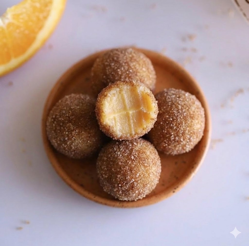 White brigadeiro rolled in cinnamon sugar, finished with a dulce de leche topping
