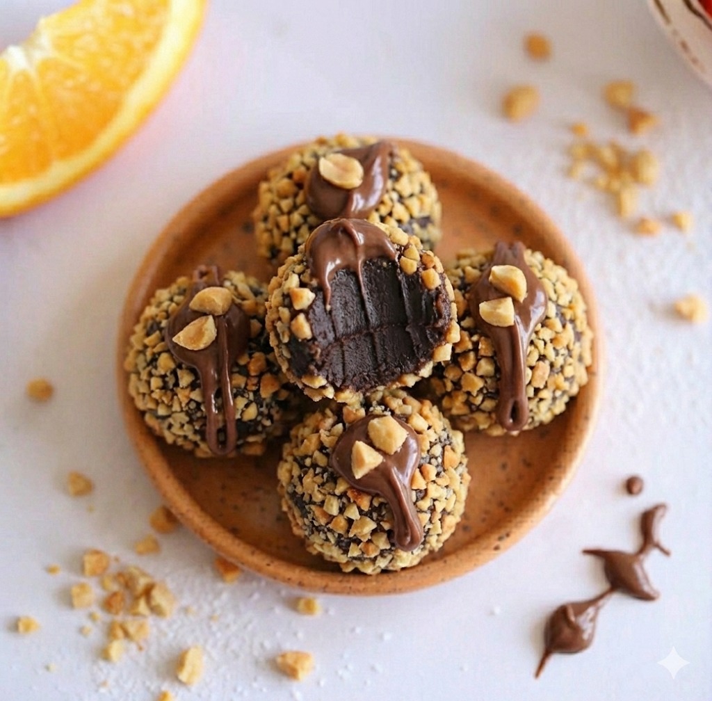 Dark chocolate brigadeiro rolled in crushed peanuts, finished with Nutella on top