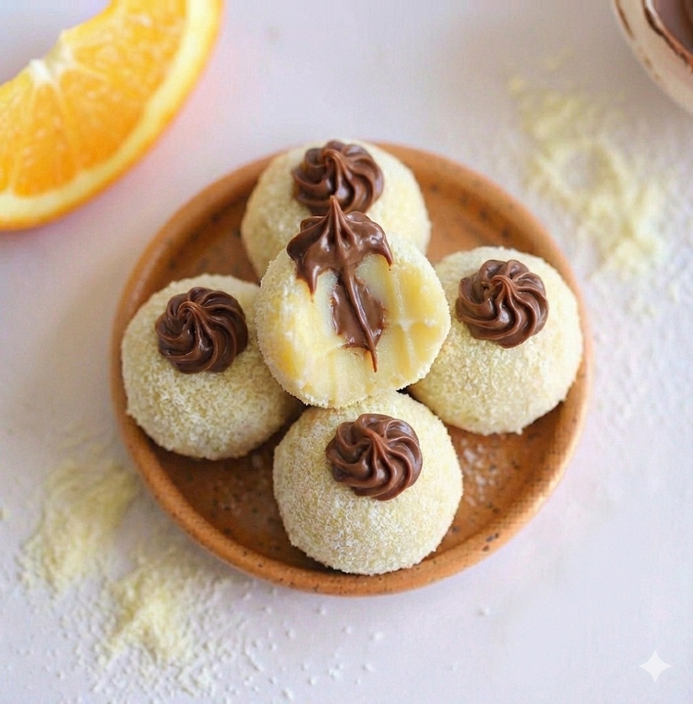 Creamy Nido milk brigadeiro rolled in powdered milk, filled and topped with Nutella.